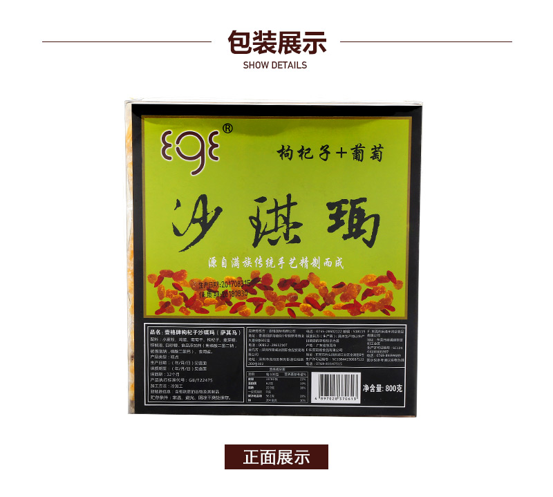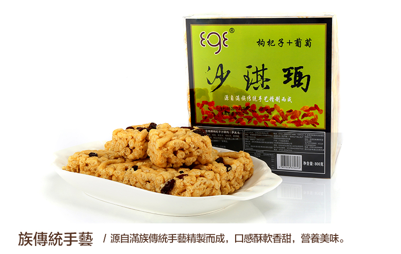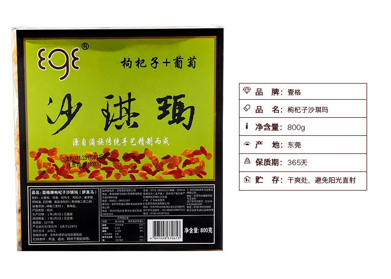 小麥粉、雞蛋、葡萄干、枸杞子、麥芽糖、棕櫚油、白砂糖、食品添加劑(焦磷酸二氫二鈉,碳酸氫鈉,磷酸二氫鈣)、食用鹽