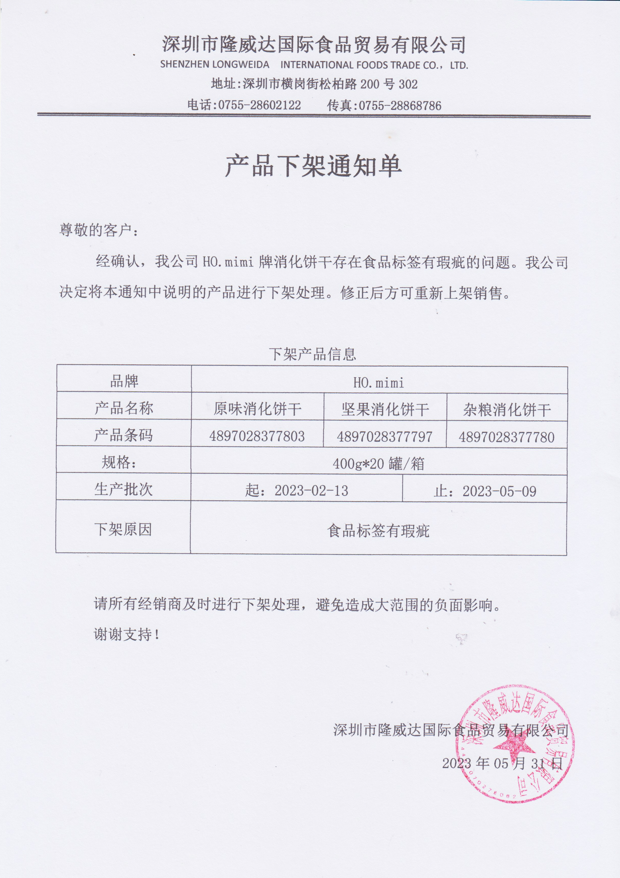 HO.mimi牌消化餅召回通知